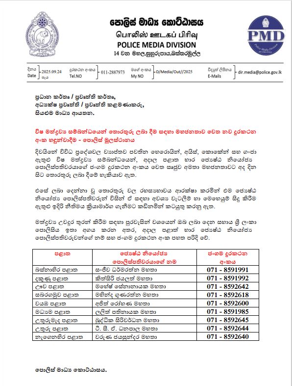 මත්ද්රව්ය උවදුර තුරන් කිරීම සඳහා පුරවැසින් වශයෙන් ඔබ ලබා දෙන සහාය ශ්රී ලංකා පොලිසිය ඉතා අගය කරන අතර, අදාල පළාත් භාර ජ්යෙෂ්ඨ නියෝජ්ය පොලිස්පතිවරුවන්ගේ නම් සහ ජංගම දුරකථන අංක පහත පරිදි වේ.