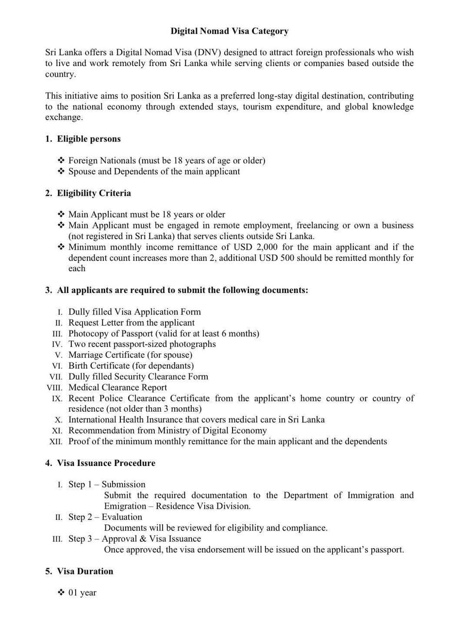 මෙමගින් විදේශීය සමාගම් හෝ සේවාදායකයින් සඳහා ශ්රී ලංකාවේ සිට දුරස්ථව සේවය කරන වෘත්තිකයන්ට සහ ව්යාපාරිකයන්ට මෙරට දිගුකාලීනව රැඳී සිටීමට අවස්ථාව හිමිවේ.
