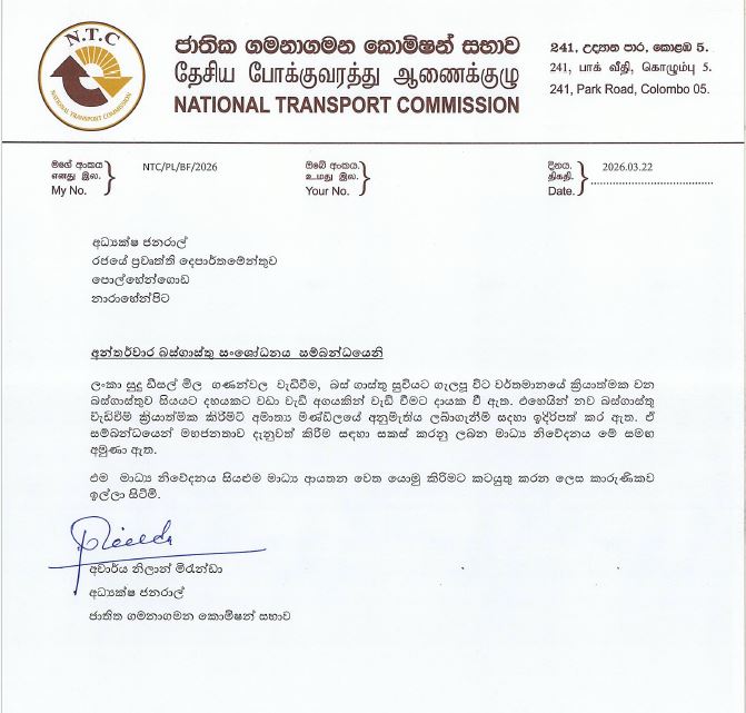 බස් ගාස්තු 10% කට වඩා වැඩි අගයකින් ඉහළ දැමීමට යෝජනා කරමින්, කැබිනට් අනුමැතියට යොමු කෙරේ. - ජාතික ගමනාගමන කොමිෂන් සභාව