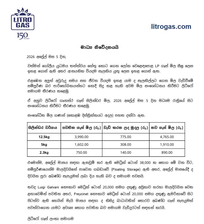 අද (05) මධ්යම රාත්රියේ සිට ලිට්රෝ ගෘහස්ථ ගෑස් මිල ඉහළට.